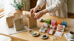 また、持ち歩き用の紙袋が付属しているかどうかもチェックポイントです。自前で袋を用意する場合は、箱のサイズに合わせたマチのある袋を準備しておくことで、手渡す瞬間の所作まで美しく整えることができます。